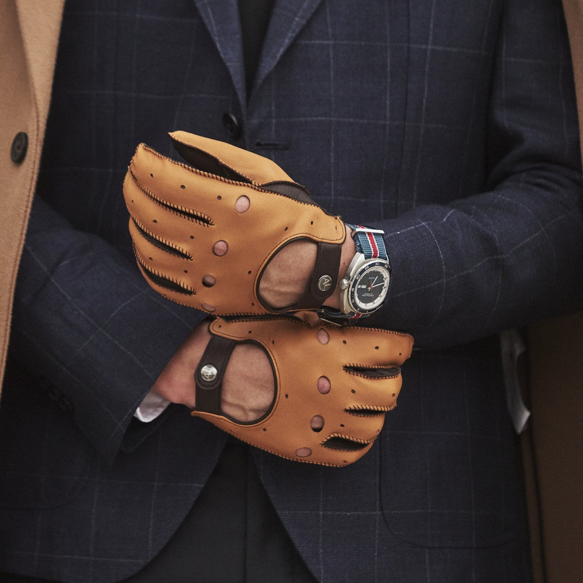 Su diseño bicolor aporta un toque audaz y contemporáneo a un icono vintage, mientras que la costura exterior resalta su carácter artesanal y permite una mayor comodidad durante largas horas de conducción. Los troqueles estratégicamente situados favorecen la transpiración natural de la mano, evocando los guantes que llevaron los grandes pilotos de la historia, pero reinventados para el conductor moderno.