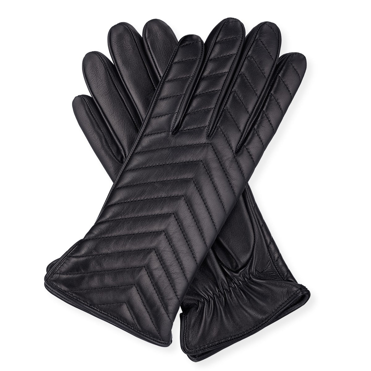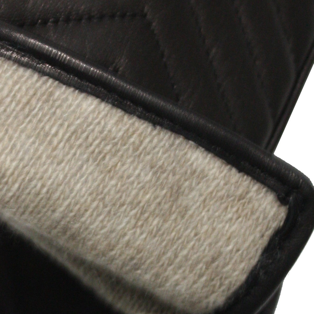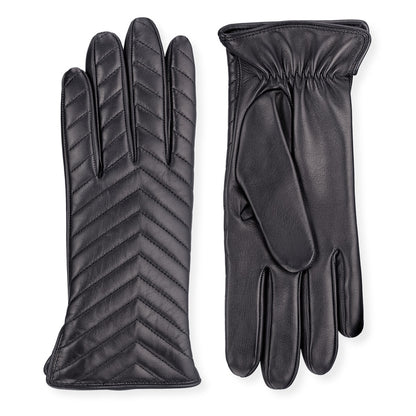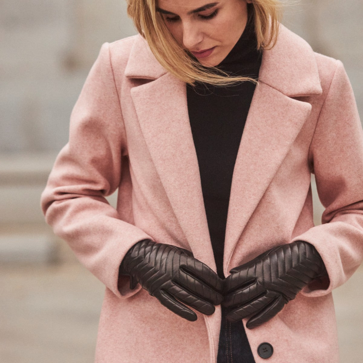 Guantes de mujer en piel de napa negra con elegante motivo chevron, un patrón acolchado en forma de espiga o zigzag que aporta estilo y sofisticación a cualquier look. Este diseño matelassé combina tradición y tendencia, convirtiendo cada par en un accesorio de moda atemporal.