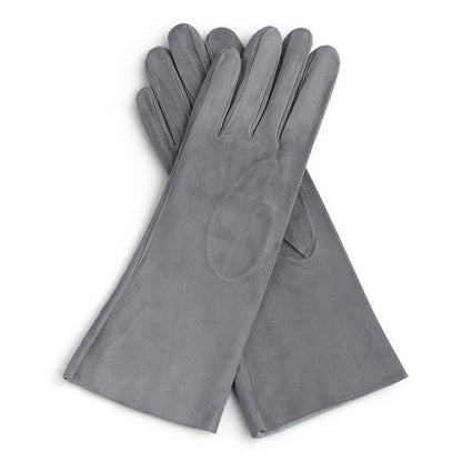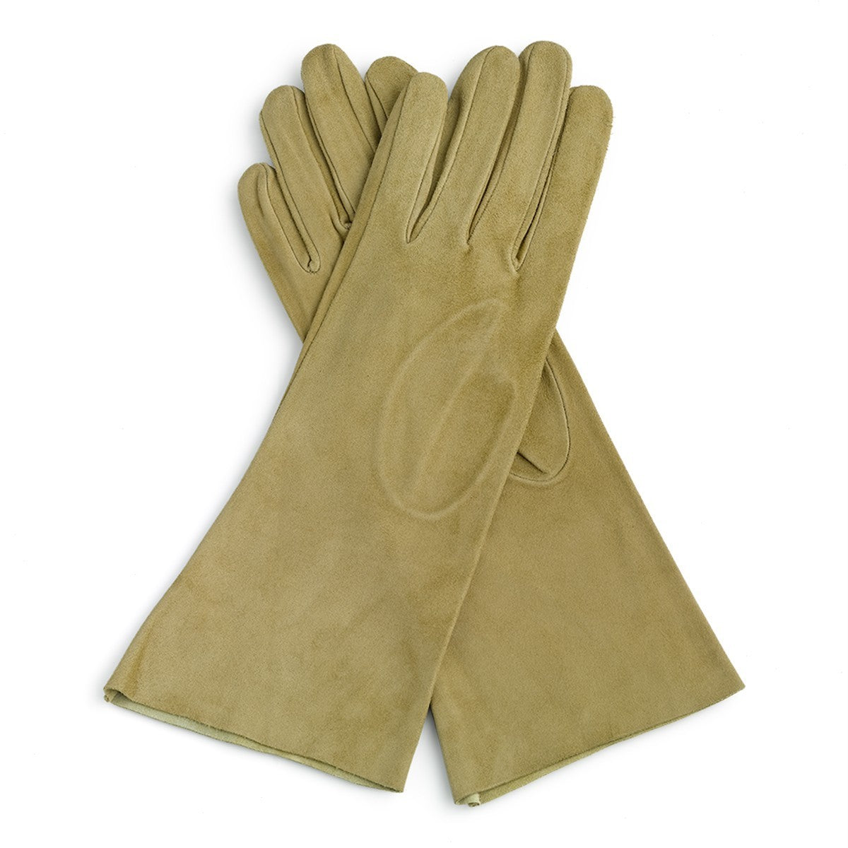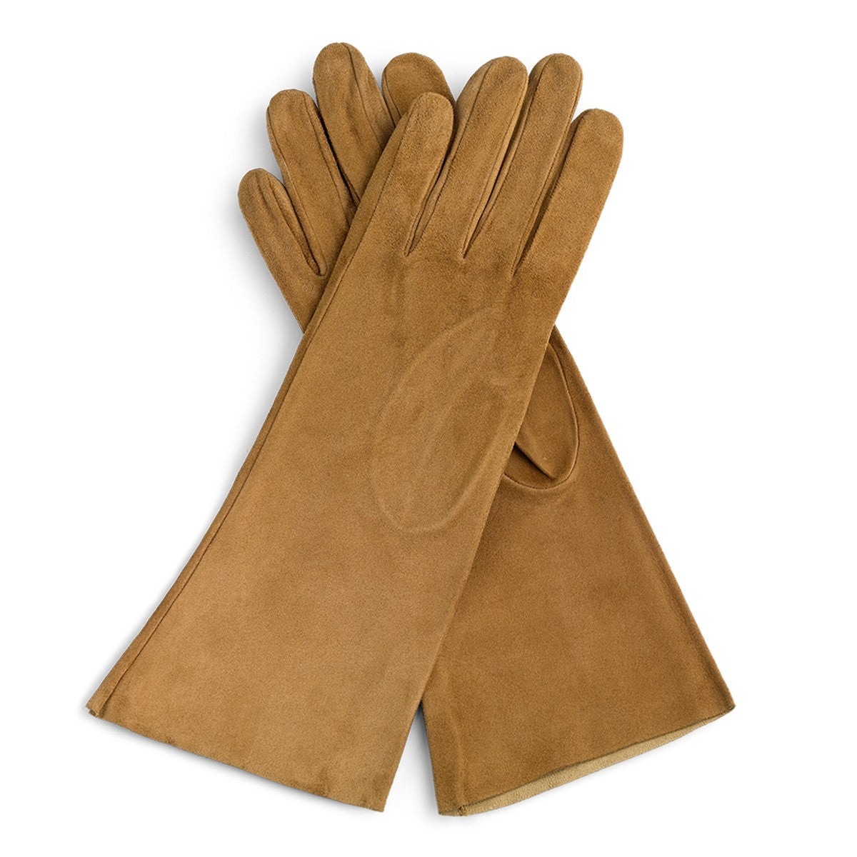 Elegantes guantes de mujer confeccionados en ante suave y aterciopelado, diseñados para aportar estilo y comodidad. Su longitud, por encima de la muñeca, es perfecta para múltiples ocasiones. Una pieza atemporal que combina lujo, funcionalidad y delicadeza artesanal.