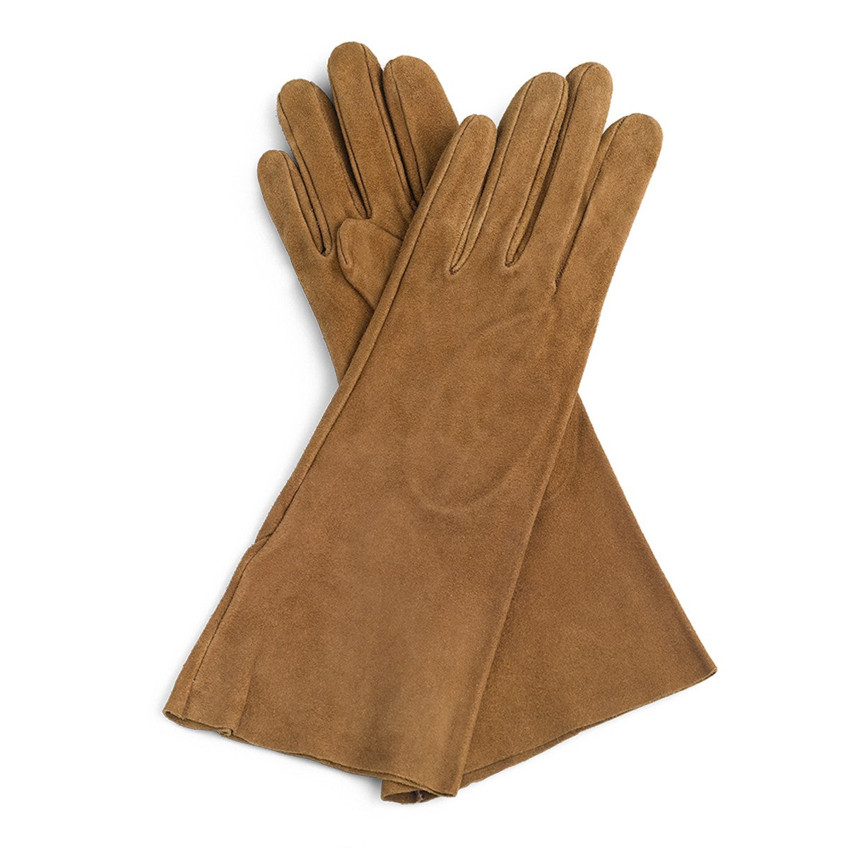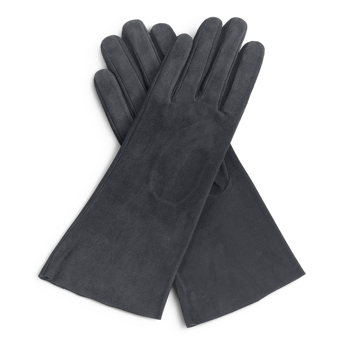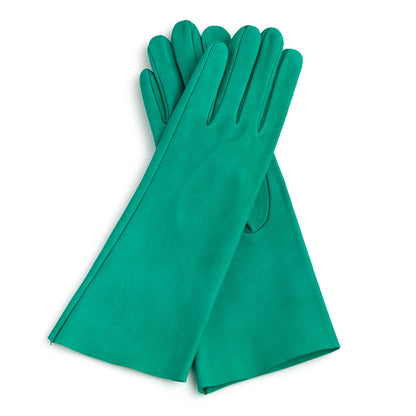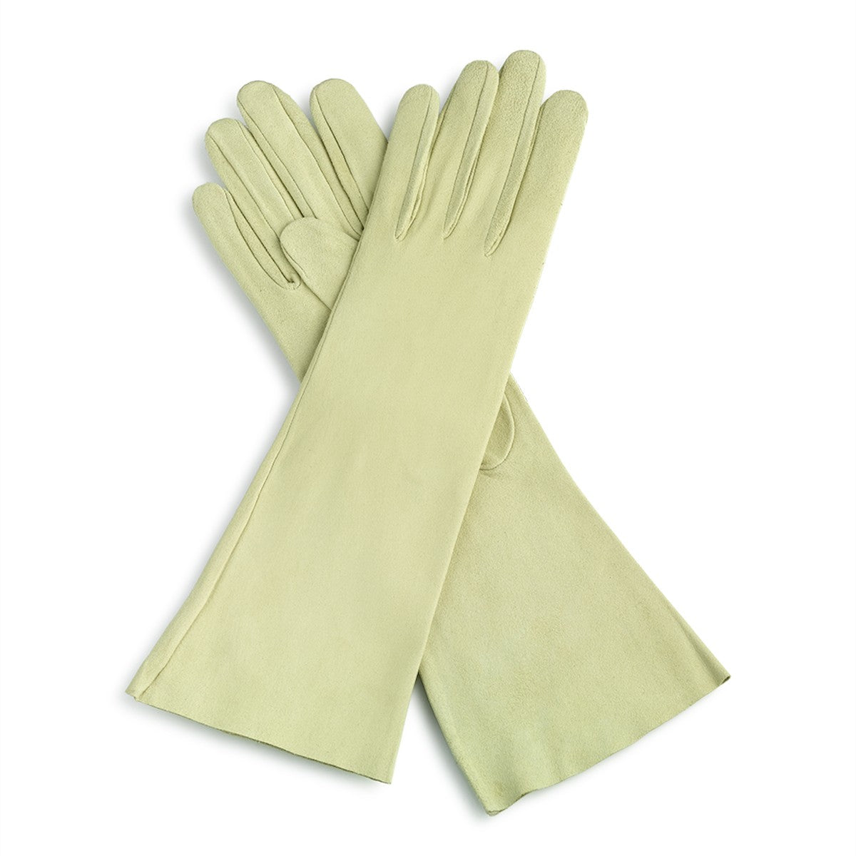 Elegantes guantes de mujer confeccionados en ante suave y aterciopelado, diseñados para aportar estilo y comodidad. Su longitud, por encima de la muñeca, es perfecta para múltiples ocasiones. Una pieza atemporal que combina lujo, funcionalidad y delicadeza artesanal.