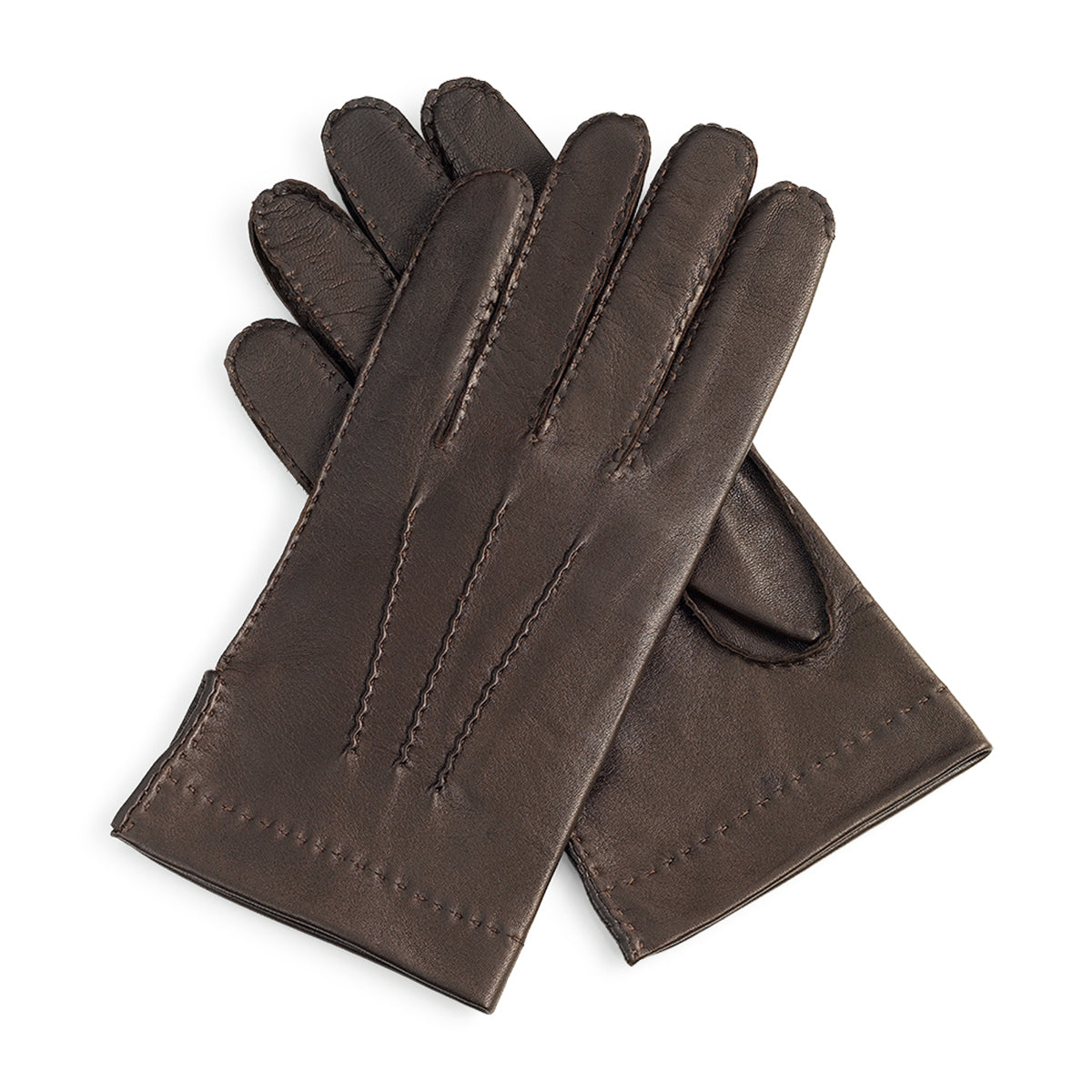 Guantes de piel de estilo clásico, con tres venas y costura interior. El acabado sin forro se ajusta cómodamente a las manos, mientras la costura hecha a mano aporta un detalle artesanal.