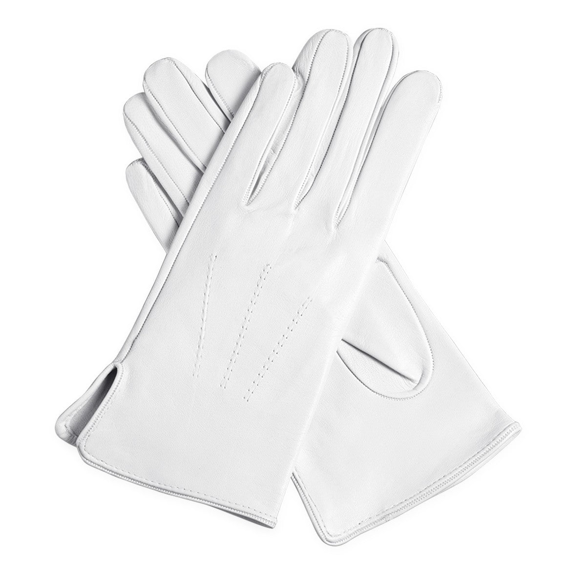 Guantes clásicos de mujer en piel color color blanco con detalle de tres costuras en la zona central, abertura lateral y ribete en el puño. Especialmente diseñado para lucir en ceremonias, cofradías y otros eventos.