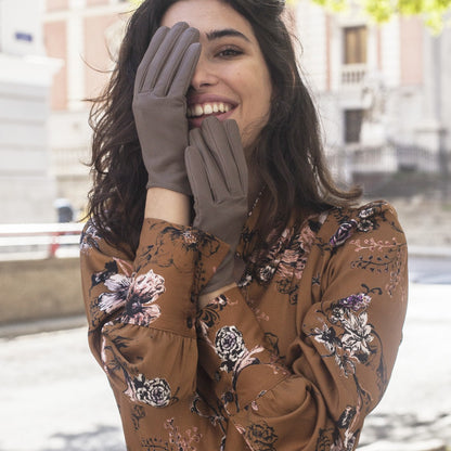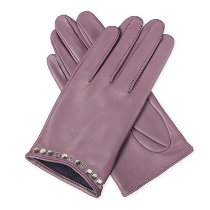 Este modelo de guantes de piel combina diseño contemporáneo y espíritu juvenil, convirtiéndose en una pieza única para quienes buscan marcar estilo con sus accesorios. Disponible en dos versiones, un elegante tono topo liso y otro en color malva con detalle de tachuelas decorativas, aporta un aire fresco y sofisticado que destaca sin perder versatilidad.